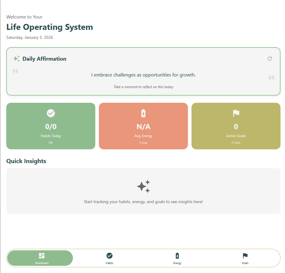 Life OS is a personal operating system built to help structure daily life through habits, goals, and intentional routines. Built with React Native, Expo, and TypeScript, it uses a modular, cross platform architecture to model personal growth as an evolving system rather than a collection of tasks.