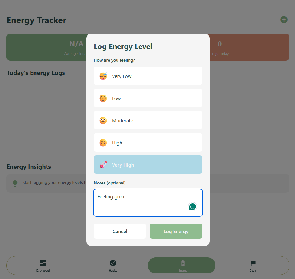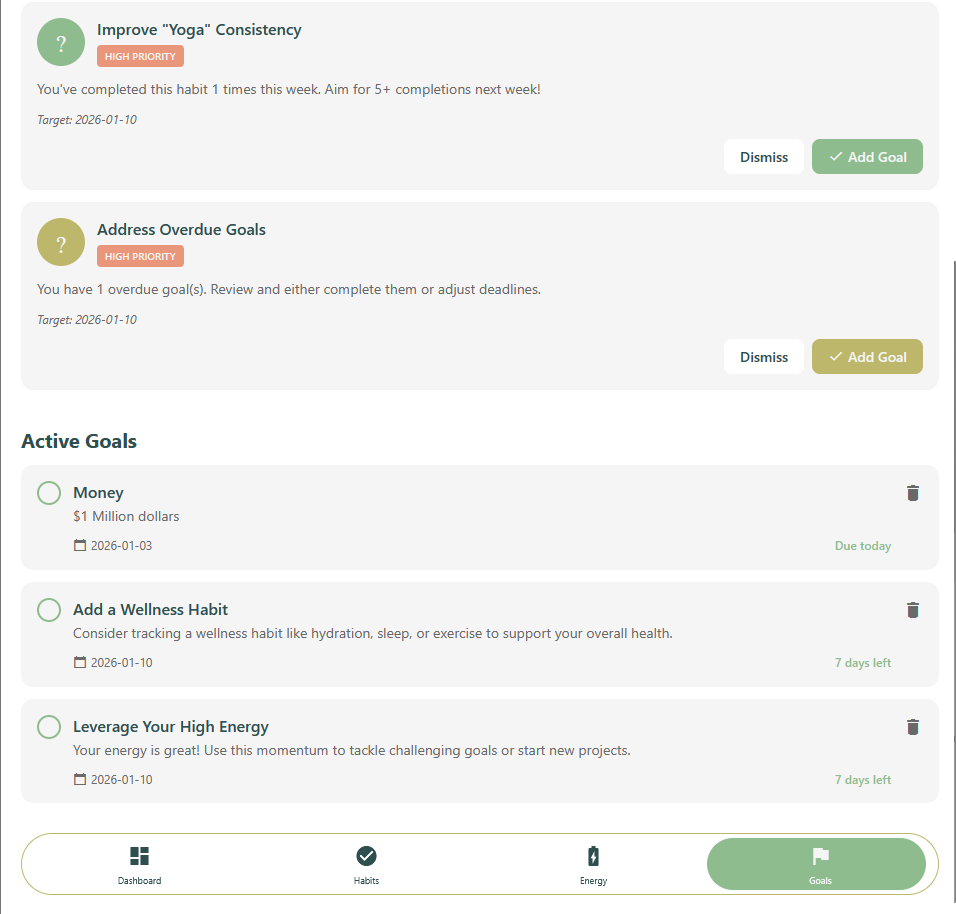 Life OS is a personal operating system designed to help individuals structure their daily lives through intentional systems rather than isolated tasks. The application brings together habit tracking, goal management, and daily energy logging into a unified experience that emphasizes consistency, self awareness, and long term growth. Instead of focusing on productivity shortcuts, Life OS models personal routines as evolving data, allowing users to better understand their behaviors and build sustainable momentum over time.