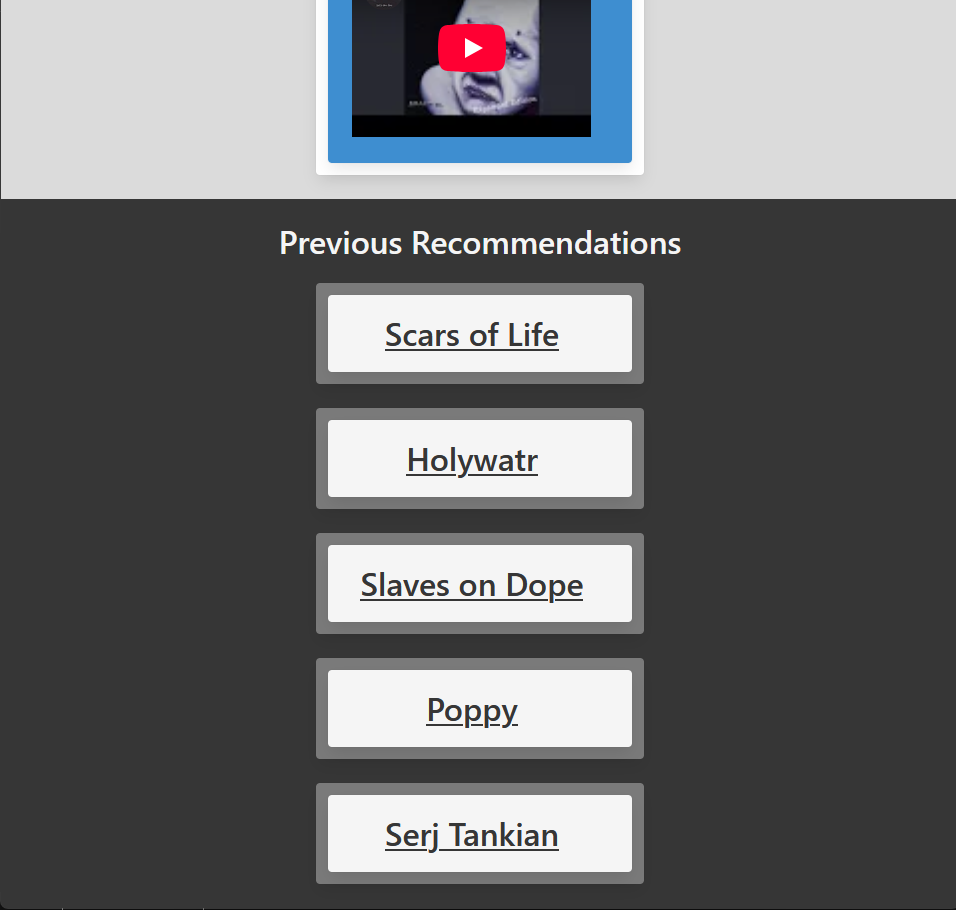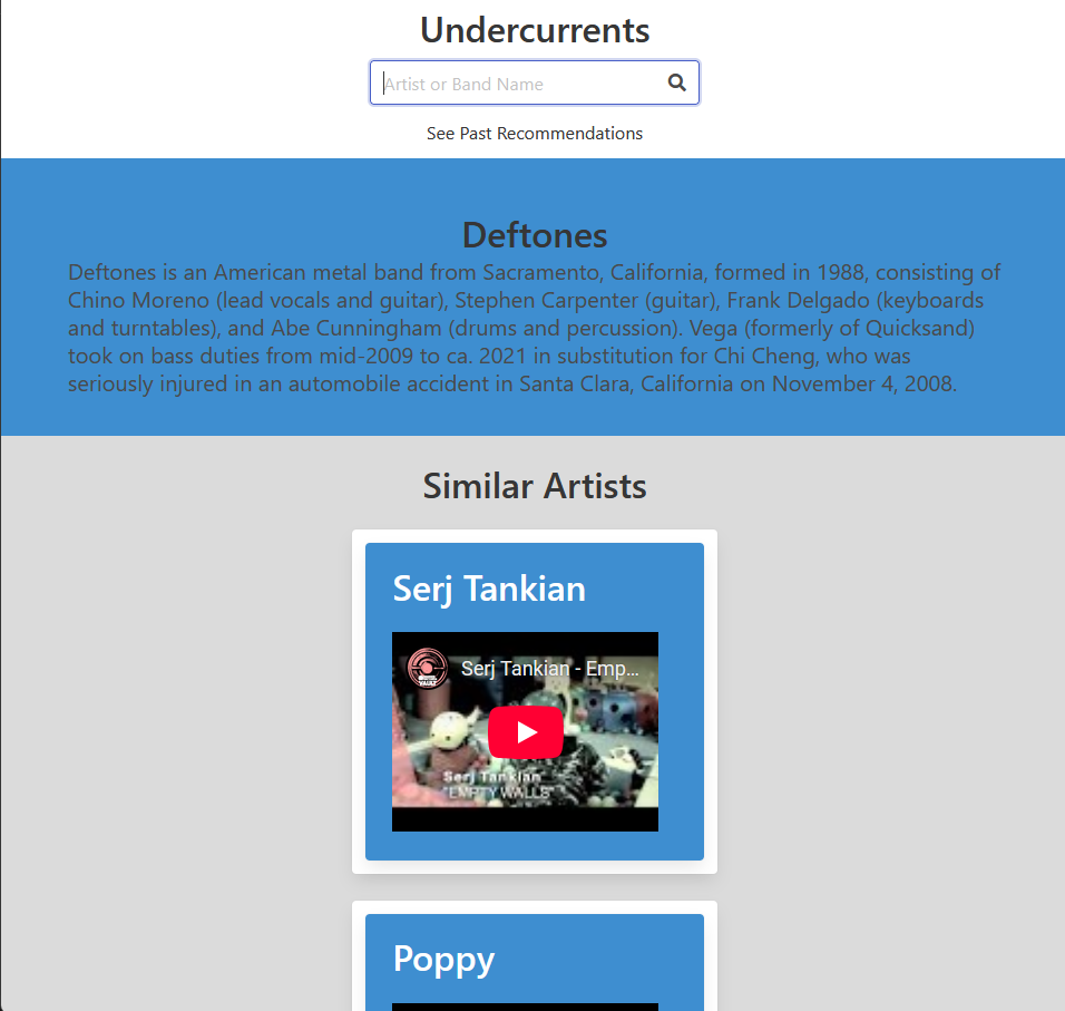 Find artists similar to the ones you already love and give them a listen and a helping hand. Bulma CSS is being used to style the webpage. We’re currently utilizing the Last.fm and YouTube API to deliver artists of a similar genre. Last FM API is used to find a user specified artisit, their bio and other similar artists. Using that information YouTube API is being used to acquire music videos of the similar artist. The application uses jQuery to update the html on the page. It uses JavaScript fetch method to connect and retrieve the necessary data from the APIs. The application has several error checking functionalities built into it as given below.